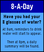 8-A-Day is a timeline Watchapp that reminds you to drink 8 glasses of water a day. At 9am, reminders to drink water will start to appear in your timeline. Then at 8pm, a daily summary will be found that tells you how many glasses of water you drank during the day. Simply start the app, and everything will be set up automatically. Each reminder notification has two options: 'Yes' increments your daily count and creates another reminder in an hour on your timeline. 'No' postpones the current reminder by 15 minutes. IMPORTANT: 8-A-Day requires an active internet connection, so if you do not receive your reminders or the timezone doesn't sync, ensure you have a good internet connection before you open the app and wait for 30-60 seconds to ensure the sync is a success. (Don't worry, once it's set up you don't need to do this again until your timezone changes!)