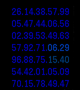 Displays a screen of mostly random numbers with the Time and Date "hidden"--the uppermost left value is the hour, uppermost right is the minutes, lower left is the month, lower right is the day. The screen refreshes every minute with new random numbers.