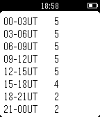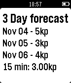 This app shows you the aurora borealis forecast for the next 3 days and the current activity... New data is generated every 10 minutes. You can press the Select button to see the hourly forecast, weather forecast and sunrise / sunset (UTC time)