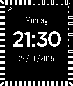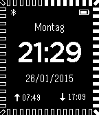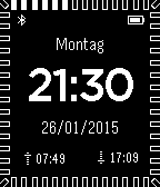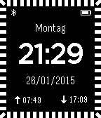 This watchface shows bluetooth icon when your phone is connected. Also current battery level is shown. Both bluetooth and battery can be disabled in the settings menu. It is possible to configure the shown weekday for the following languages: english, german, italian. Current seconds are shown as border "dots". border-dots can be disabled after a configurable amount of no movement or disabled entirely. Sunrise and sunset can be displayed. Therefore current GPS location will be loaded from your phone. If no GPS location is available last stored version is used and shown with dashed icons.