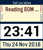 Aus BOM Weather is a watchface that reads the feeds from the Australian Bureau of Meteorology every 15 mins using the location set by the user. Australian capital cities, larger population areas and points of interest that have BOM weather stations are selectable via the settings on the Pebble app. A web address of a BOM weather station can be manually entered for locations not preset. This must be the web address of the json list (e.g. Perth is http://www.bom.gov.au/fwo/IDW60901/IDW60901.94608.json ) The BOM station name is shown at top of screen. Note: If the BOM is not showing a reading for one of the 4 items that are displayed, then the watchface will display 'na'. Please ensure you set a location on the settings.