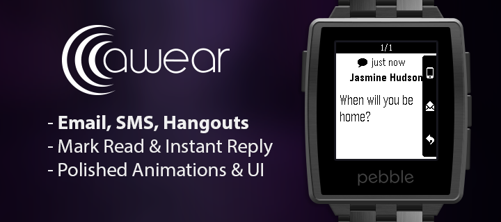 Instant 2-way communication. Respond and mark SMS/emails/Hangout read. ★SMS - Send and respond to SMS with a few clicks ★EMAIL - Mark read, archive, star or delete! - No more spam. Use gmail filters or our smart filter to remove it ★CALENDAR - 2 clicks let people know you're running late ★WEATHER - Daily and weekly forecasts Use Awear as your watchface or only for communication!