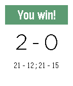 An easy to use pebble app to count the points during your badminton game. Hit the bottom button when you score, the top button when your opponent scores. The final score will be displayed at the end of the game. The last result will be available from the app launcher (new App Glance feature of OS 4). This app is an adaptation of Ben Gourley's Pebble Tennis to the badminton game.