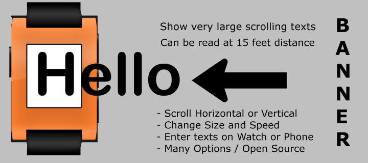 BANNER will show very large scrolling characters/texts on your watch. This allows for showing texts to others up to 15 feet away. Texts are stored in the watch and may be entered on the phone or on the watch. Texts may be scrolled both horizontally and vertically. All Help texts are available on the phone and on the watch using single word help (Spritzing) All settings can be changed on the watch, no need to use your phone. Created with CloudPebble. Thank you Katharine! Open Source, use in your own App. See: https://github.com/Ruud48/Pebble-Banner