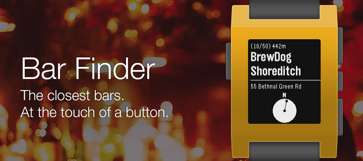 Thirsty? Now with Bar Finder the closest drinking establishments are delivered to your wrist at the press of a button. Bar Finder will tell you how far it is, the street name and even point you in the right direction. Note: This has been fully tested on iOS but should also work on Android - please give feedback on your experiences!