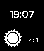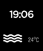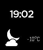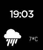 This watchface displays weather by connecting to the BetterWeather DashClock extension on Android. It will display one of the more than 10 icons available to reflect the current condition and the temperature in C or F and wind chill if there's one.