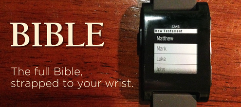 The full Bible strapped to your wrist. Navigate the entire Bible using fast book and chapter selection. Read chapters of the Bible right on your Pebble. Bible version is the New English Translation. Bible API provided by Bible.org, Copyright ©1996-2006 Bible.org, reprinted with permission