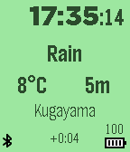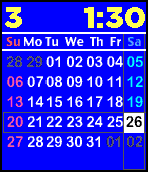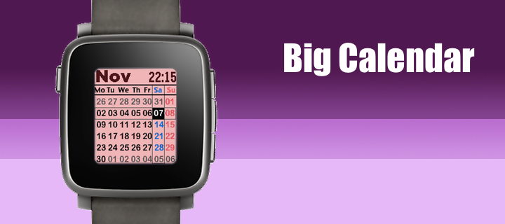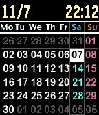 This is a monthly calendar viewer with digital watch. you can select other months with up/down key. Also you can show following informations with enter key. - time with second - weather condition, temperature, wind speed - bluetooth connection status - battery remaining level - weather forecast with down key If you frequently use this app, try to register at quick launch. key operation - up : previous month - enter: toggle information display mode/ return current month - down: next month configuration - color theme - date format - week beginning with sunday/monday - time type 12H/24H - time second display on/off - gray days of prev/next month display on/off - units type of temperature and wind speed C&meter per second/F&mile per hour - weather location type gps/city name/zip code/lat&lon Note: you can't select with date format with Day of week and second display on.