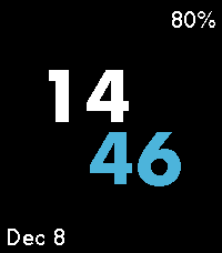 Simple watchface with big numbers for people with old eyes. Give your wrist a quick twist to show the date. The battery level will appear when charging, or when the level is 30% or less.