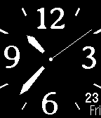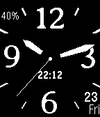 Basic analog watchface with multiple configurable options such as battery percentage, digital hour, seconds, week day in english or spanish, black or white default theme or alter white and black theme wih a simple wrist shake. Vibration on loosing connection.Thanks to Twatch author for sharing source code. Wathface analógico básico, con múltiples opciones configurables, tales como porcentaje de batería, que muestre la hora también en digital, segundero, fondo negro o blanco, alternar entre fondo negro o fondo blanco con una sacudida, o dias de la semana en inglés o castellano(español).