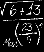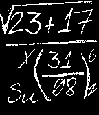 Formula/equation on a blackboard. Under the root sign, are the hour and minutes. Below them a parenthesis enclosing the day of the month (numerator) the month number (denominator). Before that, two-letter week day. Up this, a number ranging from to 10 Indicates the remainig battery.