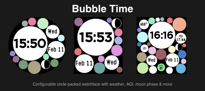 A playful watchface where time, date, weather, and more float in a colorful circle-packed layout. Each bubble displays useful information at a glance. Features: - Time (digital or analog), date, day of week - Temperature, weather conditions, sunrise/sunset times - Air quality index (AQI) with color-coded levels - Moon phase, battery level with segmented fill - 6 color palettes: Random, Warm, Cool, Pastel, Vivid, Monochrome - Toggle any bubble on or off from settings - Layout refreshes every 10 minutes for a fresh look Weather data from OpenWeatherMap. Requires phone connection for weather updates. Not for trypophobes.