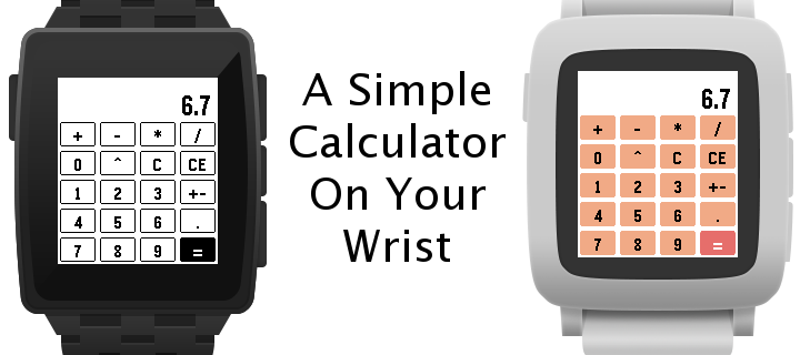 A simple calculator app for the Pebble Classic, Steel, Time and Time Steel. Supports addition, subtraction, multiplication, division and exponentiation. Supports up to 2 digits of decimals using fixed-point arithmetic. Credit to Wojciech Siewierski for his fixed point arithmetic implementation. It was made for his GravCalc Pebble app.