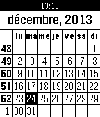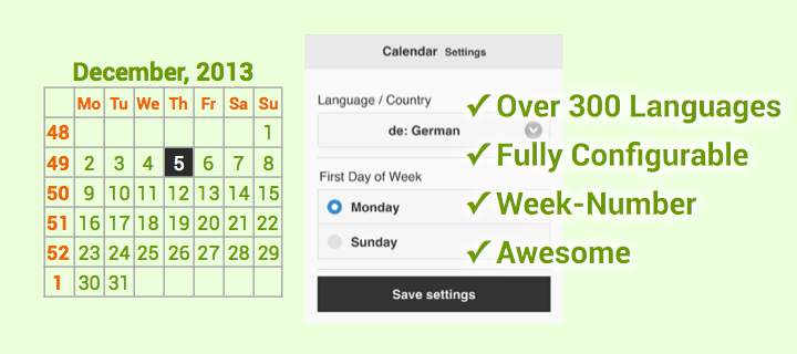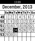 International Calendar. Monthly view including the week number. Localization configurable for over 300 countries/language presets.