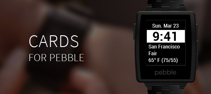 Cards lets you display any information you want on your Pebble's screen. Choose from a variety of data sources, including: - Calendar - RSS - Weather - Stocks - Transit - Driving Time - Sports - World Clock - Sunrise Sunset - Battery (watch) - Note - Custom Note: Cards was formerly known as Pebble Cards.