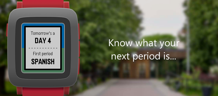 NEVER FORGET WHAT CLASS IT IS! (At least if you go to Colonel By.) With CB Schedule, you'll be able to: - See the current day and what your next class is with a few clicks of a button! - See your entire schedule, course codes, teacher, and room number with just another! (Plus, icons for almost every class!) - Add your friends' schedules so they don't get lost either! - See your schedule on the Timeline, so you don't even need to open the app! - A cow picture, if you figure out how to see the credits. Requires setup with Pebble app. Unfortunately, the app is not magical and cannot guess your schedule. :(