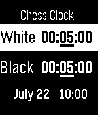 Here is a chess clock on your wrist. App is already in settings when you open it. Using the up and down buttons adjust the time. The select button cycles through the hours, minutes, and seconds. Press and hold the select button to start the count down. White will countdown first. Pressing either the up or down switches timers. Select button brings the app to settings.