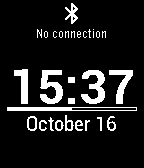 A clean, low power usage watch face that always shows the time, date and battery status. Bluetooth warning is shown when the Pebble is not connected (toggleable vibration when the BT status changes). Battery is represented by the bar between time and date. The face is offset vertically to line up with the middle button on a Pebble Steel.