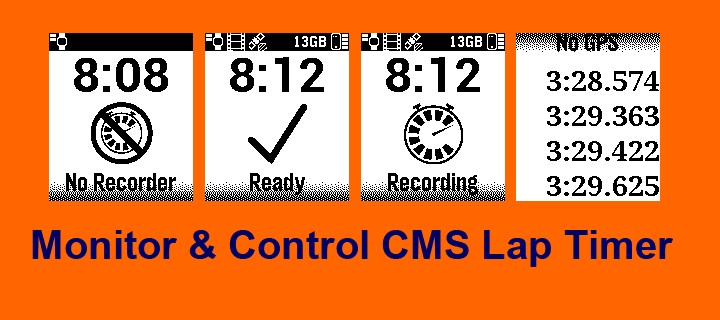 Monitor the status of CMS Lap Timer running on your smartphone or tablet. Start/stop recording via center button when the Lap Timer is in manual recording mode. Review lap times.