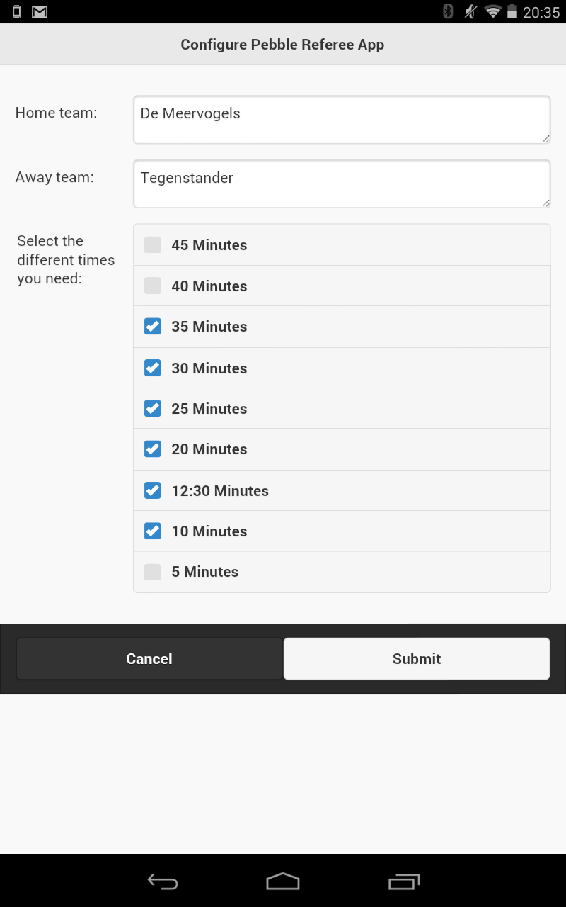 Tools & UtilitiesStop using a piece of paper and your stopwatch. With this app you can control the complete game. Countdown of time with vibration feedback on one minute befor the game time is over. Update: Added settings menu for the Pebble App, you can enter the home and away team name. Added a new menu when the timer is running, double press the middle button. In this menu you can reset the time or score.