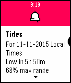 DailyIf you sail or race on Sydney harbour, you should find this app useful! It is a browser on your wrist that you can use to display weather data in a watch friendly format. You need to configure the app before use by going to the Settings screen & pressing the Default button Once configured, it can provide constantly updated measurements from 3 Sydney Harbour weather stations some 3 south of Sydney (so you can watch a southerly change approaching!). If you select bom.gov.au, updates are provided about every 10 minutes. Data is displayable from North Head, Sydney Harbour, Fort Denison, Syndey Airport, Wattamolla, Belambi & Pt Perpendicular. It will also display the current forecast if properly configured. Sydney Closed Waters is the default. Note that since some text is abbreviated to attempt to fit in available space on the Pebble, the source web site should be relied on for a current and accurate forecast. Scroll up & down the 7 stations using the UP & DOWN buttons. Display the latest forecast with a single short press on the centre SELECT button. Display the selected tide forecast with a double click on the centre SELECT button. Manually request fresh weather data with a long press on the centre SELECT button. The app will automatically request the current weather every 10 minutes - this function allows you to request an update on demand. Caution - if left active on a mobile data connection, it will use approximately 12MB per day. It does not retrieve data when the watchapp is not displayed. Data you access is for your personal use only.