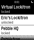 RemotesControl your Lockitron lock right from your Pebble! Built using Pebble.js and Cloudpebble.net. Thanks Huy and Katharine! No locks? remember to log in: My Pebble -> Pebbletron -> Settings Source: http://goo.gl/2iZdeG Known Bugs: - on-boot the mainMenu may hold the wrong state of each lock - mainMenu does not refresh after changing new favLocks - there's an extra window for some reason
