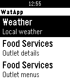 DailyWatApp uses the University of Waterloo Open Data API to display information on your wrist. It includes the following; ~ Weather - Displays the University weather forecast for the day. ~ Food Services Locations - Displays food services locations including a description, building location, notes, and hours of operation. ~ Food Services Menu - Displays the weekly menu (lunch and dinner) for food service outlets ~ Coop Infosessions - Displays employer infosessions for the current term ~ Holidays - Displays upcoming University holidays ~ Parking availability - Displays the number of available spots in parking lots