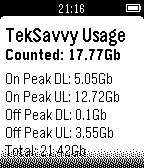 Tools & UtilitiesTekSavvy Usage will let you keep track of your current month's bandwidth usage (both on and off peak). This information is usually updated once per day. Press the select button to refresh the data. You will need to configure your API key for this app to be useful. Follow the link in the configuration page if you do not know it already. I am not affiliated in any way, shape or form with TekSavvy (beyond the fact they are my ISP). I found a use for this app, and they have OK'd it, so I'm publishing it for others to hopefully find useful as well.