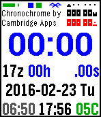 DailyModes: clock, stopwatch, and countdown (with overtime count-up). At the top right, in all modes, is a linear display of the hour, minutes, and seconds. All modes also show the UTC(z) hour, the date and day, sunrise and sunset, temperature, two user-info text fields, and status icons for stopwatch, countdown, Bluetooth, and battery. Clock mode also displays the day's percent change in the DJIA and NASDAQ. Chromochrome vibrates on the hour (in clock mode), and upon Bluetooth disconnection, starting the stopwatch or countdown, and countdown completion. If you exit and reenter the app, the stopwatch and countdown times will be as if the app had been running all along. You can choose 12- or 24-hour format (defaults to watch default), force-refresh the stock data, select Celsius or Fahrenheit, and change the text of the user-info fields. Buttons: Top, Middle, Bottom M: cycles -> clock-> stpw -> ctdn -> clock: T: select setting-submode for clock -> stocks -> temp -> info1 -> info2 clock: B: toggle 12/24hr mode stocks: B: force refresh (if BT connected) temp: B: toggle C/F M: exit setting-submode usrinfo: B: update usrinfo field, select 1st char T: select next char (at end of field, go to 2nd field or exit setting-submode) B: modify selected char: if a-z, uppercasify then cycle through space, a-z, 0-9, and .+-_@# stpw: T: stop -> reset B: start/resume ctdn: counting down: T: stop -> reset -> init overtime: T: reset -> init B: start/resume ctdn init: T: select next digit B: inc selected digit M: exit init