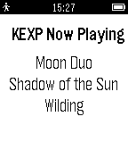 DailyKEXP Now Playing shows at application start the currently playing song on the radio station KEXP (http://kexp.org/). Force it to refresh by pressing the center "SELECT" button. Track information is shown as artist, album and then song title. Note that "air breaks" and any API failures display as dashes. While this application uses KEXP's public API, it is NOT authorized or warranted by KEXP. The author does not speak for KEXP.