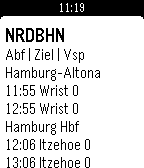 DailyGerman: Überprüfe die Verspätungen der Nordbahn (www.nordbahn.de), Start Bahnhöfe können ausgewählt werden (Settings auf der pebble App am Handy). Klicke auf 'Select' um die Angaben zu Aktualisieren. Die Liste zeigt: Startbahnhof Original-Zeit | Zielbahnhof | Verspätung Daten werden vom Verspätungsmonitor auf www.nordbahn.de gelesen. English: Tracks the Nordbahn departures from any stations, only useful in northern Germany.