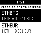 DailyEasily get current Ether or Bitcoin value on your watch! Supported tickers: BTCEUR, BTCHKD, BTCUSD, ETHBTC, ETHEUR, ETHUSD, REPBTC. Data is fetched from Gatecoin public API. Please note that since Gatecoin does not provide ETHUSD ticker, it is an estimation based on ETHBTC and BTCUSD tickers.