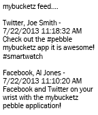 NotificationsThe mybucketz watch application allows you to view the most recent posts from your Twitter/Facebook/Tumblr/LinkedIn feeds. The application integrates with the free web based social media aggregator http://www.mybucketz.com.