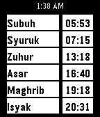 DailyView Singapore prayer times right from your Pebble watch! Data retrieved from MUIS*. * requires your Pebble to be paired to your phone for it to function Handcrafted by Faruq Rasid from Ave3.