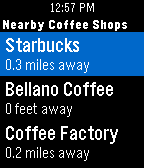 DailyEver have that moment when you are trying to find coffee shops in an area you're not familiar with? Fret not, CoffeeTime is here to guide you. All you have to do is to launch CoffeeTime, and you will see a list of nearby coffee shops along with its distance (This process could take up to 5 seconds as your phone's GPS pinpoints your location). Click into it and you can see the store's address so you know which direction to go! - Possible Use Cases - > Experiencing caffeine withdrawal in an unfamiliar territory > Craving for coffee while stuck at a traffic light > Suggesting a #coffeemeetup with your buddies > Not sure where to bring your crush to a coffee date without awkwardly checking your phone Last but not least: We do not store your location information nor do we collect any other data. Now you can look for coffee right at your wrist!