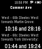 DailyTimetable for Warsaw public transport provided by ZTM. Currently supports buses, trams and trains (SKM and KM), but does not support night buses (due to the limitations of data provided by City of Warsaw). You need to configure first. Add bus/tram stops by their name and number. Optionally you can add a default line that will be displayed on select. If not provided, pushing select button will display the list of lines. Long press of select button always displays the list of lines. ---- Rozkład jazdy ZTM Warszawa. Aktualnie wspiera autobusy tramwaje oraz SKM i KM, ale nie wspiera autobusów nocnych (ograniczenia danych m.st. Warszawy). Najpierw należy skonfigurować przystanki. Wymagana jest pełna nazwa przystanku oraz jego numer. Podanie nr linii jest opcjonalne. Wciśnięcie guzika select przenosi do listy linii. Jeśli w konfiguracji podana została linia, zostanie wyświetlony od razu rozkład dla tej linii. Długie przytrzymanie guzika select zawsze spowoduje wyświetlenie listy linii (nawet jeśli ustawiona jest linia domyślna).