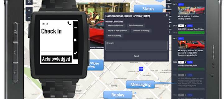 CommandWear is a simple-to-use, mobile, scalable and affordable platform that integrates smartphones, wearables, tablets and networks to improve situational awareness for emergency responders who must keep their eyes, ears and hands on the job at all times. The Pebble Communicator App gives first responders tactile feedback of incoming messages improving communications in noisy conditions or when responders are unable to reach their phones. In conjunction with the Smartphone Communicator App, the Pebble Communicator App provides • An intuitive and simple interface for receiving and sending messages; • Simple one-touch acknowledgement of messages to assure communications; CommandWear is designed to work with a public safety agency’s existing technology (e.g. desktops, laptops, tablets and smart phones). There are three components to the platform. • The HUB is a highly scalable, secure server for tracking and logging all movement and communication. • The Commander App runs on tablets or desktops and provides situational awareness in the field or operations center. • The Communicator App runs on the smartphone of the First Responder.