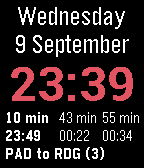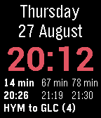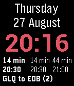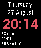 A Pebble watchface for UK rail commuters. Displays the next three trains for your daily commute to and from work. The immediate next train is shown in detail in bold. It is designed to require minimal effort to show important information a rail commuter needs on a daily basis. You can specify your normal home and work railway stations using the configuration page. Only direct rail services are supported - routes with changes won't work. Rail service data are obtained in real-time using the Huxley web service, which accesses National Rail Enquiries data. The watchface requests your current location from your phone and determines the closest railway station. If you are near your configured home station, you will be shown routes to your work station; otherwise you will be shown routes home. This means that even if you happen to travel away from your normal work station, you may still be presented with a reasonable rail service to get home. Alternatively, if location is disabled or unavailable, your journeys are still planned using the time of day and your predefined stations. Updates are requested periodically, but can be requested at any time by "tapping" (shaking) the watch. When the next train is due to arrive or is slightly late, updates are triggered more frequently. Train times are only fetched during likely commuting times. Where specified in the data, the estimated time of departure (ETD) is displayed. Otherwise, the scheduled time of departure (STD) is shown. The watchface also shows the time and date in a clear and sensible way for UK users.