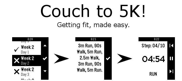 Couch to 5K (C25K) Training app. Multi lanauge support: English, Français, Deutsche, Español. Supports a list of 24 days, all with individual progress indicators. Select a day to see the steps for that day, proceed to get a countdown clock with feedback for each step along the way. Open source, check description for github link.