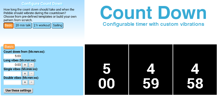 Customizable timer with vibration notifications at specified times. Giving a talk? Training in the gym? Want to know how time passes without constantly looking at your watch? Let Count Down help! Hourglass icon by Jamie Rothwell.