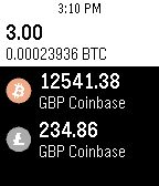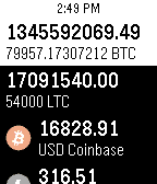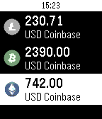 Crypto Tracker for Pebble With this app you can watch the price of Bitcoin, Litecoin, Bitcoin Cash, and Ethereum on the Coinbase Market. You will be able to choose your currency type as well. As an added bonus, you can enter a Bitcoin, Litecoin, Bitcoin Cash, Ethereum paper wallet address to track as well. The value of coin and the currency value with be displayed. If you click to select the wallet, a QR Code will appear of the wallet address. This is great for a quick receive barcode of your Bitcoin, Litecoin, Bitcoin Cash, and Ethereum Wallet. If you like this app, you can donate some BTC, LTC, BCH, ETH do the addresses below: BTC: 1D9HuDKKYY5RiMmwicV4xfuRNhVNwtmNJP LTC: LVVFkds7vYEN3yVDpXVPeMUtMYKZ8pNYbu BCH: 15FzrbwukP8VBXoLmKBYfmb8ELK5NxTtns ETH: 0xf02a22f7b4fd26264f6086c79785c80e04ed2256