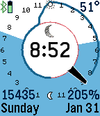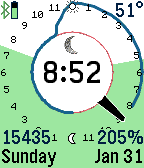Displays a graph of your activity steps against a 24-hour clock. Track your daily activity, and compare it against yesterday's. Use the custom Settings button for different options, including setting your step goal. The sunrise and sunset times are where the top and bottom colors change. Tap the watch to display weather information. There are customizable settings for your daily goal, temperature scale, screen colors, and more. Pebble Health is required, so the daily steps are only available on Pebble Time smart watches. Pebble Classic users can still reference the 24-hour clock, current weather temperature, and sunrise/sunset information.