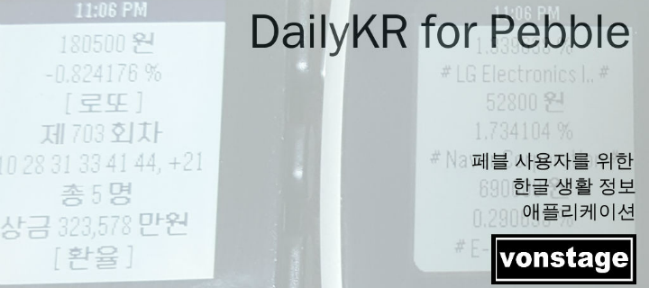 This is a daily life application for korean. 한국/한글 사용자를 위한 페블 생활 정보 애플리케이션입니다. 페블을 통해서 매일 새로운 정보를 받아 보실 수 있습니다. - 제공 정보 - 날씨, 미세먼지, 주식, 환율, 로또, RSS News feed - 지원 기기 - Pebble Classic, Time (Round 미지원) - Keyword - Pebble, Korean, Smart watch, Daily Information, 한글