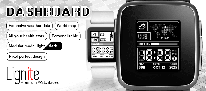 An LCD watchface beautifully designed for stats and settings! Inspired by faces like 91 Dub, this is Lignite's take on an old-school digital watch. Full feature list: - Light & dark themes for EACH individual module - Change between light/dark theme automatically depending on day/night - Weather data (temperature, condition, sunset, sunrise, wind and more) - Health stats (steps, distance, heart rate, and more) - Three different display modes: weather, body and map - Ticking colon - Hide / show only what you want to see - Bluetooth indicator - Bluetooth disconnect and reconnect alerts - Battery bar - And a few more other goodies, found in settings! We poured our hearts into this bad boy and really hope you enjoy it! ❤️ If you like Dashboard, please give it a heart! ❤️ -- This is a premium watchface that comes with a full trial. To unlock it, you can buy this face for US$1.99, or for US$5.99 you can get our Lifetime Bundle which includes all of our current and future Pebble watchfaces forever.
