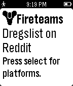 Unofficial Pebble app for /r/Fireteams on Reddit. Quickly browse posts for others Looking For Group (LFG) or Looking for More (LFM). Filter by your platform types: XBox One, XBox 360, PS4, or PS3. Shake your wrist to fetch the latest posts.