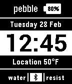 Simple digital watchface, includes: - date and time - battery percentage - current location - current temperature - bluetooth symbol Options: - 24 or 12 hours - date order - fahrenheit or celsius