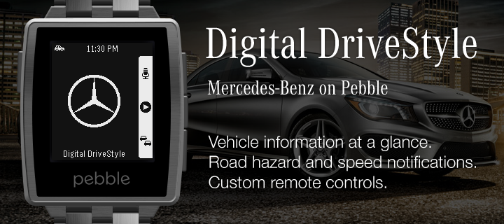 Connect to your Mercedes-Benz with the DriveStyle Watchapp for Pebble. Keep up-to-date with your car’s status, performance, and location. While driving, get alerted of road hazards, accidents, and speed limits. Remote control your navigation, social networks, and music with the companion app for iPhone. For more details on Drive Kit Plus and Digital DriveStyle, visit: drive-kit-plus.com