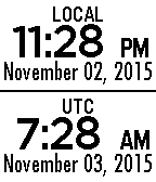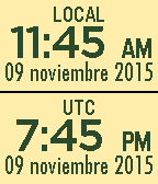 Dual time zone watchface. Top is local time. Bottom is selectable to any ISO time zone. The default is universal time (UTC). UTC is very useful for pilots, amateur radio (ham) operators, and astronomers. Any selectable time zone is very useful for those interacting with others in another time zone. Color theme is selectable in watch face Settings. Language is selectable in Pebble watch Settings. Below are supported languages: English - Français - Deutsch - Español - Português - 简体中文 - 繁體中文