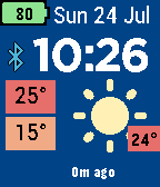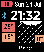 A simple watchface for daily use, with weather. Features: - 12/24 hour clock - UK/US format date - battery percentage and coloured status, including charging - Bluetooth indicator with optional vibrate on loss of connection - Weather, with current condition and temperature, daily high/low temperature (coloured ranges), last updated - Celsius/Fahrenheit toggle - frequency of automated updates, including off - background is blue during the day, black at night and red at sunset/sunrise - weather/sunrise/sunset is stored, so even if connection is lost it is still presented (indicated as "N/C" for internet loss). - location is manually entered as lat/long so you don't need to rely on the phone establishing location - Dark Sky weather API key is limited to 1000 a day - so there is an option to enter your own, created on https://developer.forecast.io/