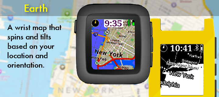 A map that rotates, tilts, and zooms. Up and down buttons zoom in and out. Pressing up or down continuously pans the map forwards or backwards. The middle button shows the custom settings, and a long middle press resets the map to your current location. Customizable features include mapping service, displaying the time, compass, battery, bluetooth, screen inversion, vibration, map labels, and more.